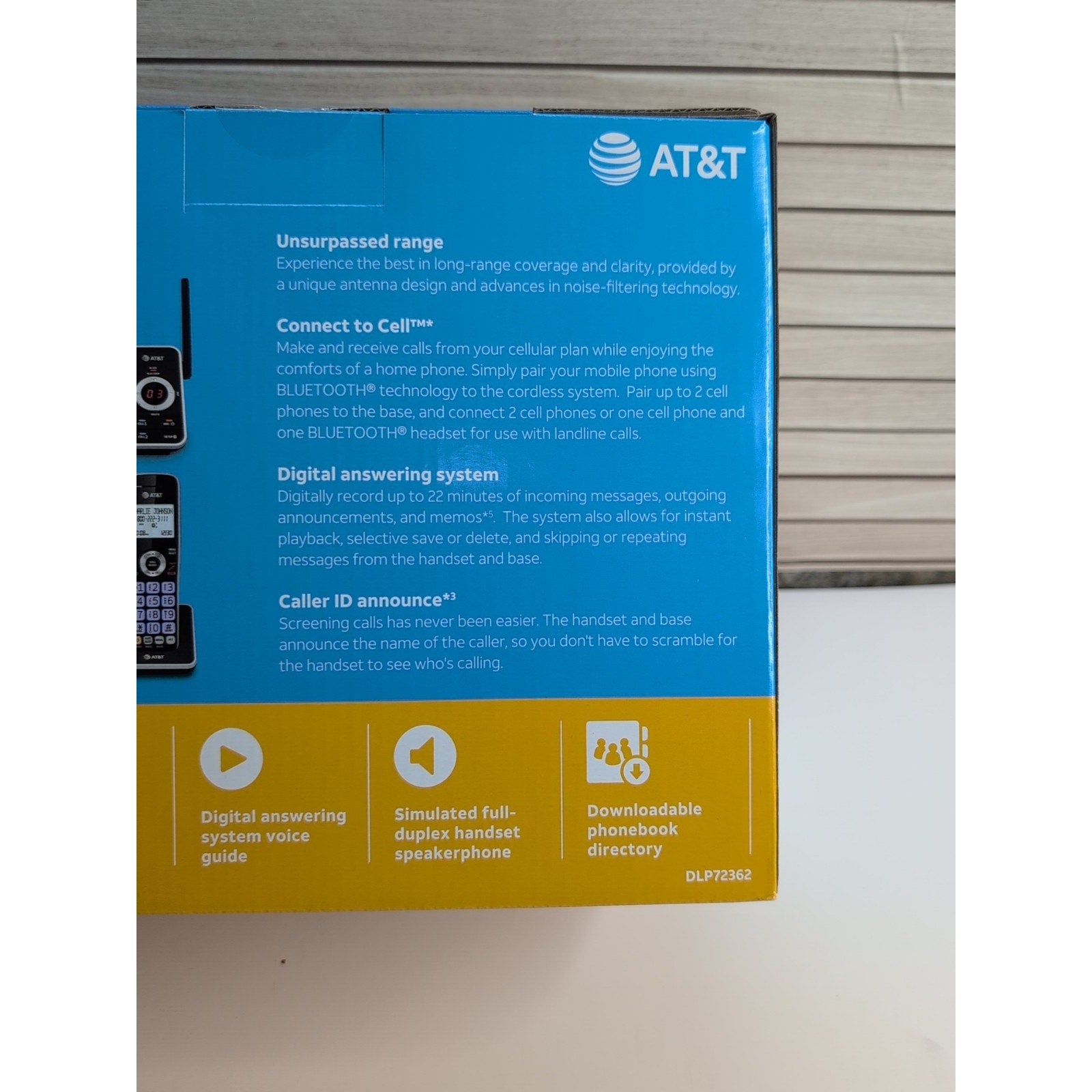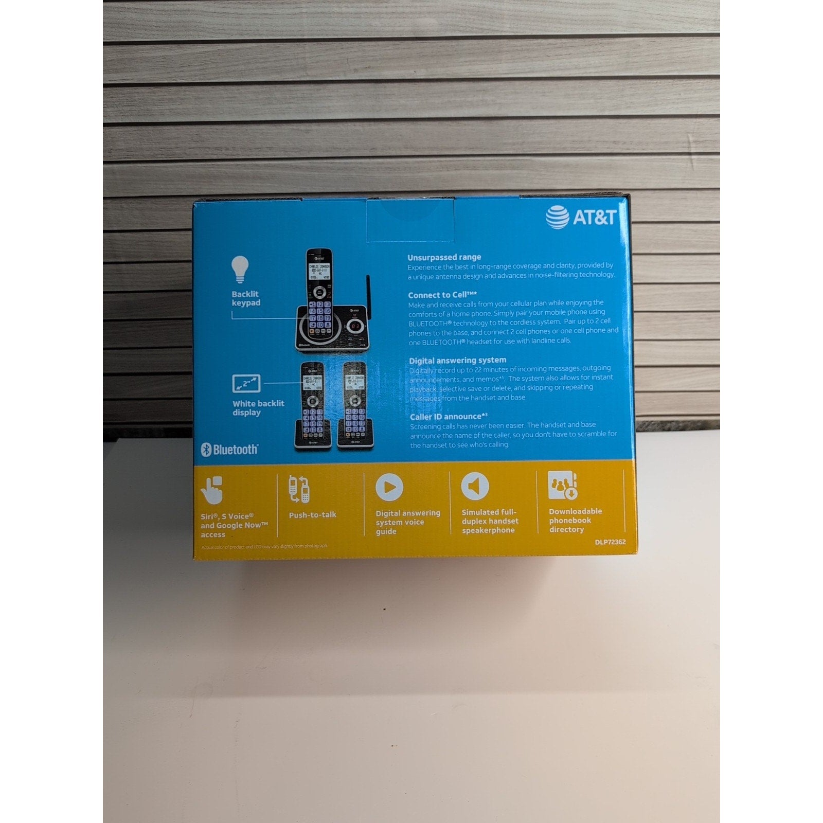 The NEW AT&T DLP72362 is a 3-handset cordless phone system with Bluetooth capabilities and an answering system. It features a sleek black design and DECT 6.0 handset frequency for clear calls. The phone has a 1-year manufacturer warranty and includes features such as wireless connectivity, Bluetooth compatibility, and speakerphone capabilities. This unit, perfect for home or office use, is designed by AT&T.