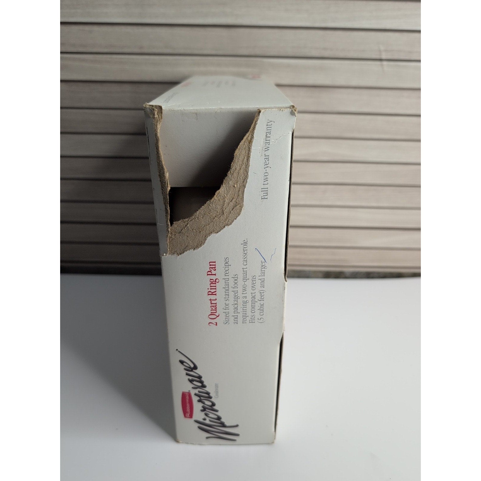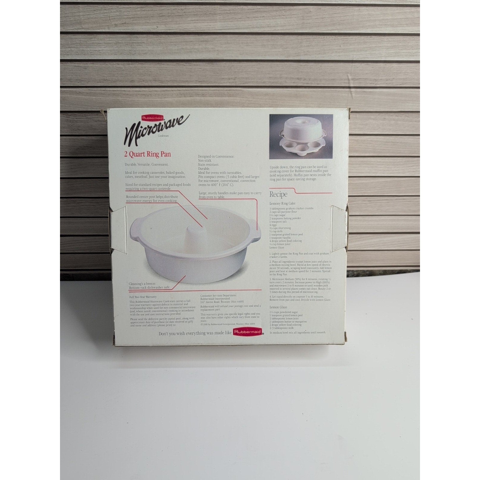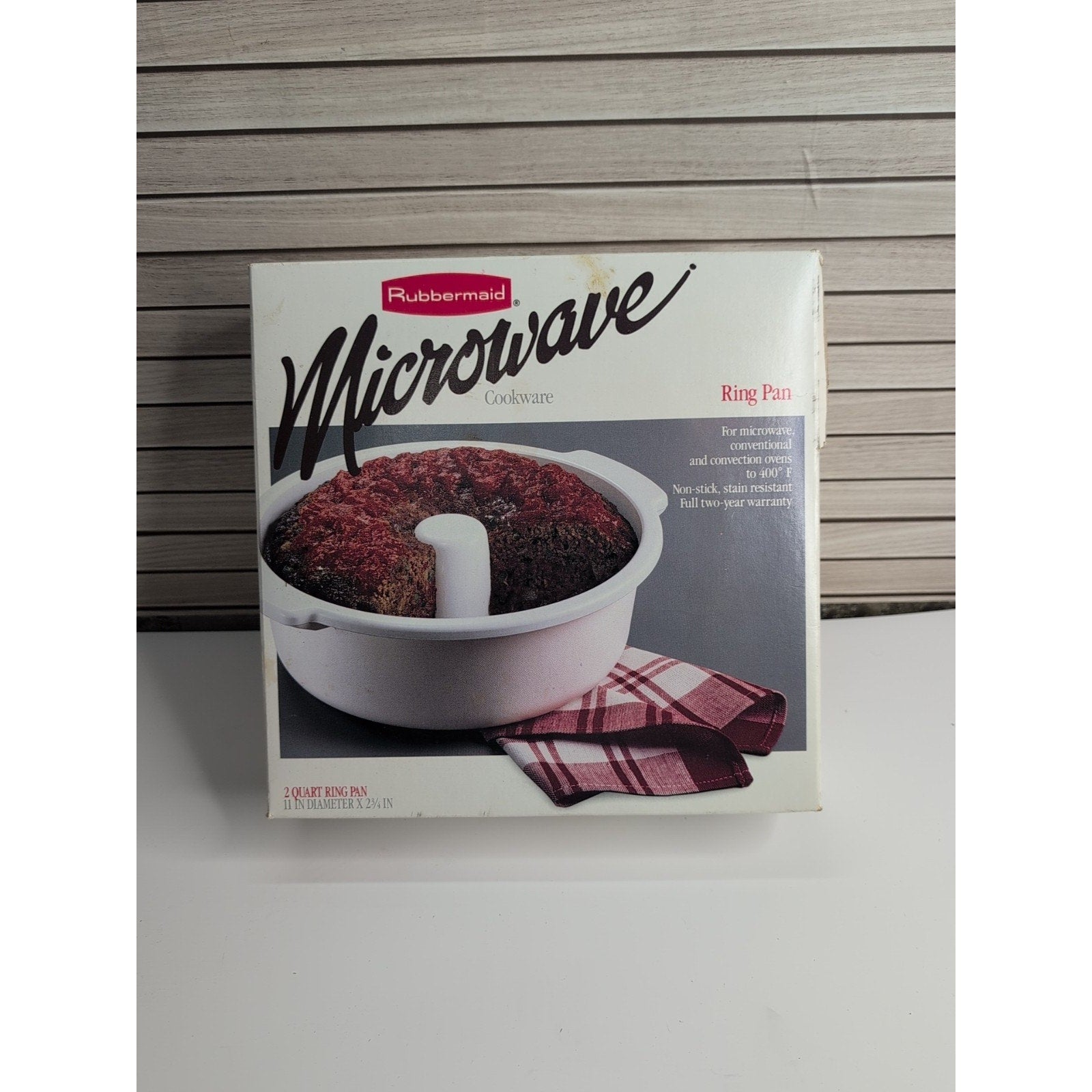 The Vintage Rubbermaid Microwave Ring Pan is a 2 quart nonstick baking pan designed for use in both the microwave and oven. Made in the United States by Rubbermaid, this white ring bundt pan has a diameter of 11 inches and a height of 2.75 inches. This unique kitchen gadget is perfect for cooking and baking a variety of dishes, adding convenience and versatility to your cooking routine.