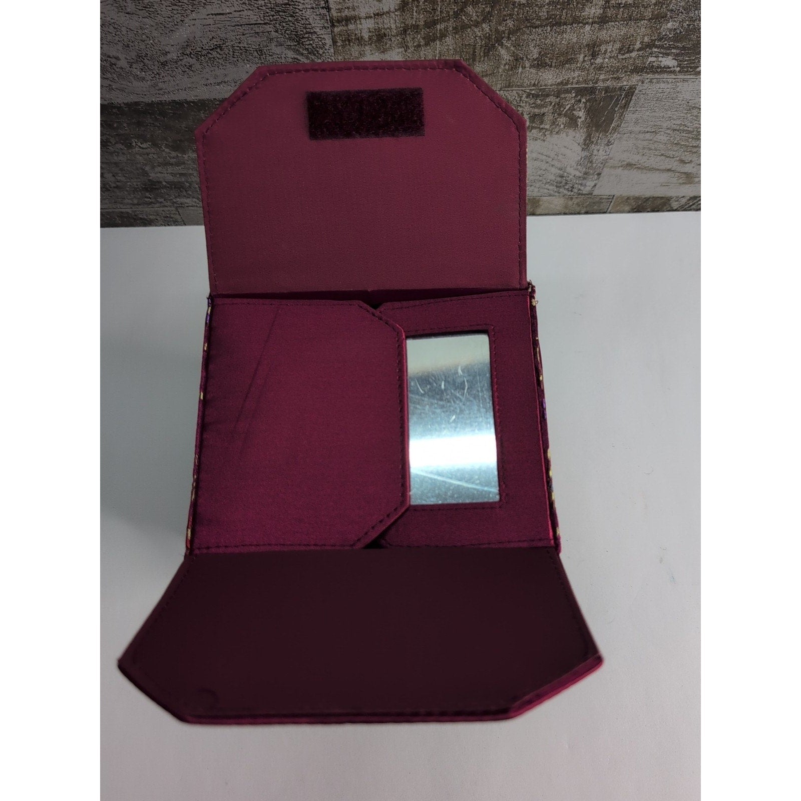 This women's Chinese "TAKE AWAY" inspired burgundy silk handbag is a small, stylish accessory perfect for carrying your essentials. The handbag features a solid pattern with a velcro closure and silver hardware accents. The exterior is made of silk with a red lining, adding a pop of color to the design. The handle/strap is made of faux leather, providing a touch of sophistication to the ethnic-themed handbag. Perfect for any outfit, this handbag is a unique and eye-catching addition to your wardrobe.